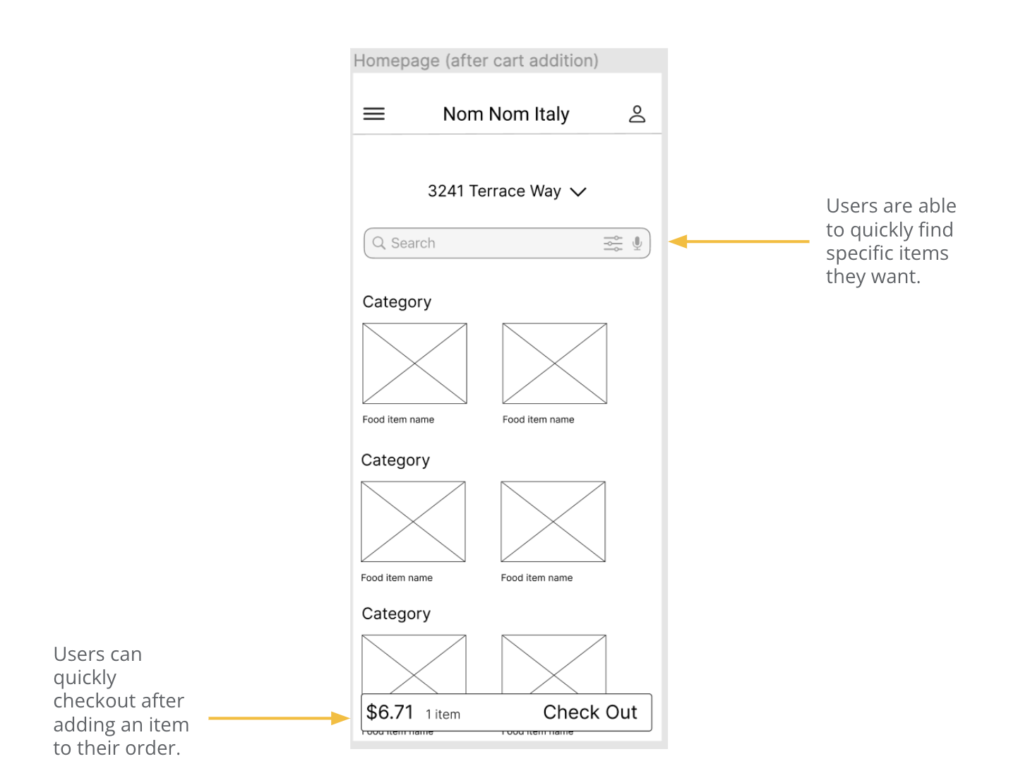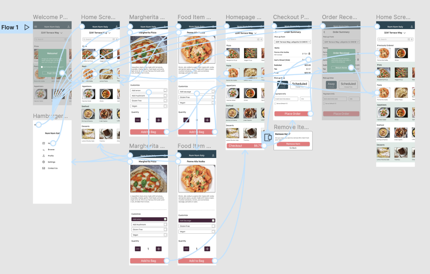 The low-fidelity prototype connected the primary user flow of creating and ordering a food item(s), so that the prototype could be used in a usability study with users.